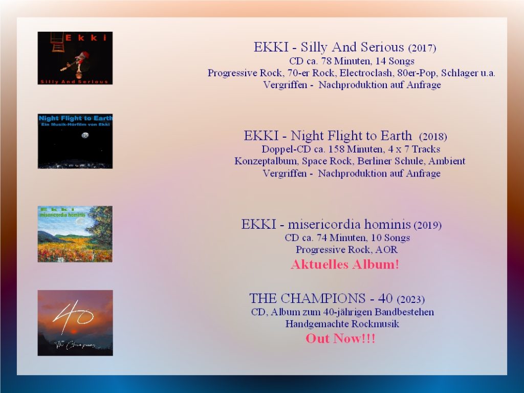 Sein aktuelles Album heißt „misericordia hominis“. Zehn Songs Progressive Rock. Siehe die Rezension auf den „Babyblaue Seiten“, der größten deutschen Site für Progressive Rock.